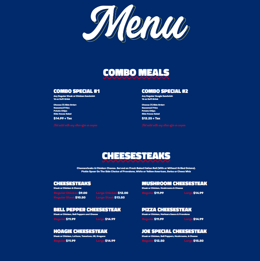 The restaurant's hoagie sandwiches, a staple of the menu, are crafted with attention to quality ingredients, offering a classic taste of Philadelphia. Whether you're in the mood for a savory hoagie or something more unique, their selection provides a variety of options to suit different tastes. For those seeking a convenient, complete meal, the combo specials ensure a fulfilling dining experience with a balance of flavors and textures.